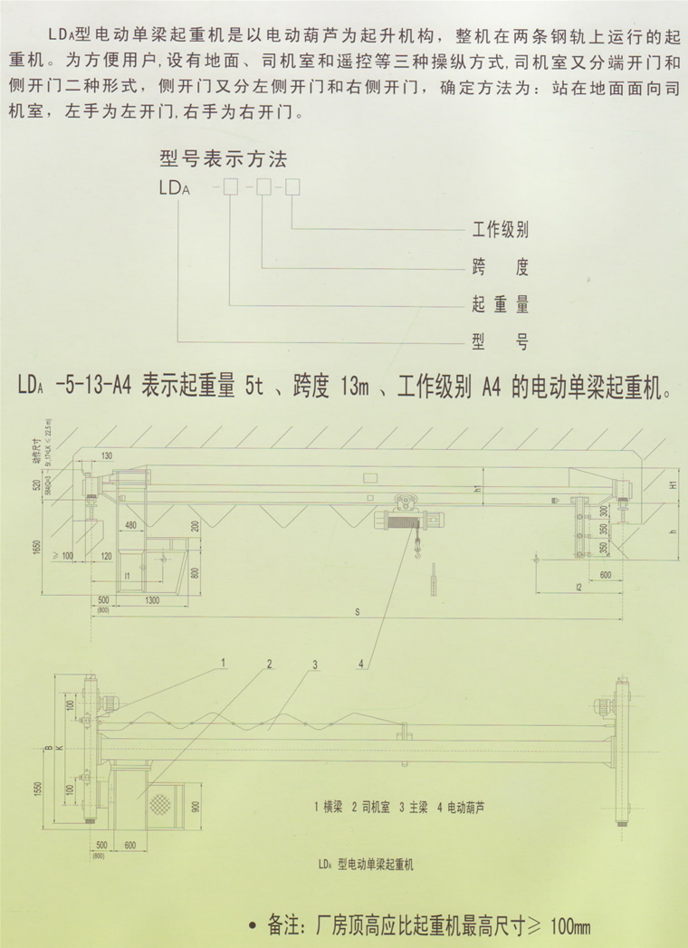LDA型電動(dòng)單梁起重機(jī)是在“LD”的基礎(chǔ)上進(jìn)行設(shè)計(jì)改進(jìn)的,較“LD型”具有結(jié)構(gòu)更加合理,整機(jī)剛性強(qiáng)的特點(diǎn)。整機(jī)與CD1型電動(dòng)葫蘆或PHH環(huán)鏈電動(dòng)葫蘆配套使用,吊鉤極限高度有要求時(shí),可以配套低矮式電動(dòng)葫蘆,是一種輕小型的起重機(jī)械。工作級(jí)別為A3-A5,工作環(huán)境溫度為-25-40oC。本產(chǎn)品廣泛用于工廠、倉(cāng)庫(kù)、料場(chǎng)等不同場(chǎng)合吊運(yùn)貨物,在易燃、易爆腐蝕性介質(zhì)環(huán)境中使用,請(qǐng)說(shuō)明,按防爆要求設(shè)計(jì)。